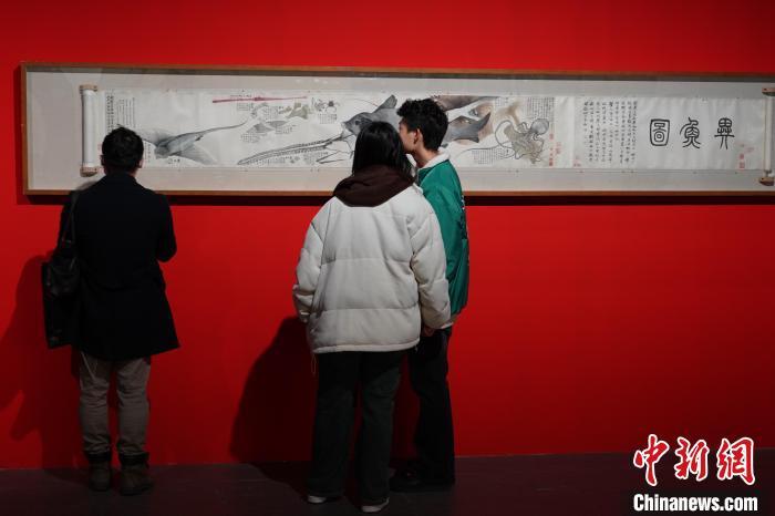 走進展廳,一幅名為《異魚圖卷》的作品,吸引了不少觀眾駐足欣賞。