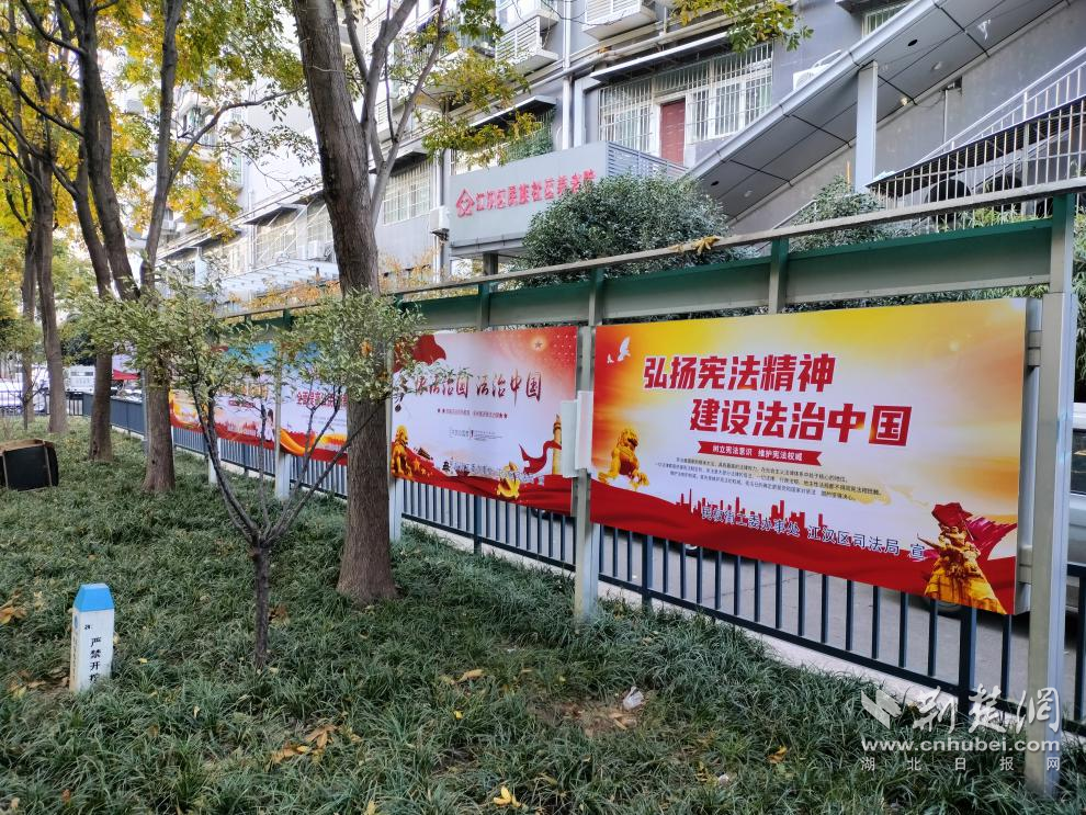 在憲法宣傳周期間,江漢區司法局民權司法所聯合民權街道打造的“法·安”民權主題文化園也即將開園,這是全區首個“黨建+法治+警務+政務+民宗+科普”一體的綜合性宣傳文化陣地,設置120多幅宣傳習近平法治思想、憲法、禁毒、民族宗教、反詐騙、安全生產等內容的宣傳欄和燈桿宣傳旗,以及2處“天圓地方”等法治景觀,通過搭建群眾家門口的法治文化傳播陣地,讓居民在日常生活中沉浸式學法。