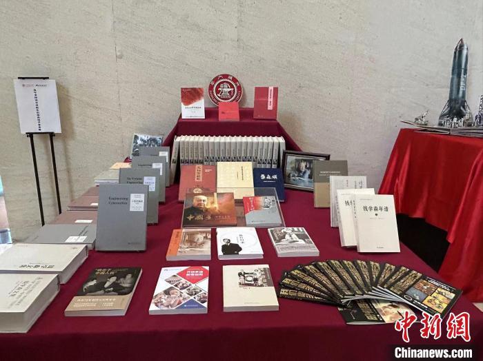 近年來國內各出版社出版的錢學森讀物。 中新網記者許婧 攝