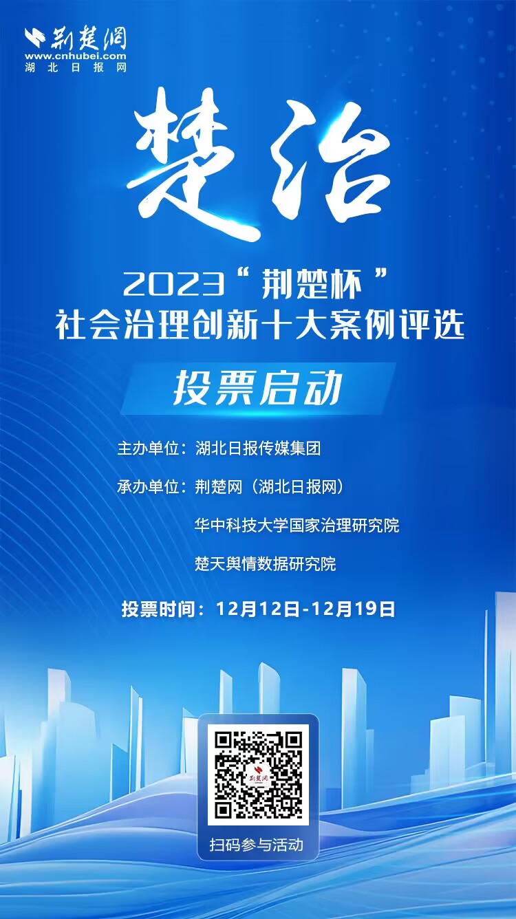 該活動由湖北日報傳媒集團主辦,荊楚網(湖北日報網)、華中科技大學國家治理研究院和楚天輿情數據研究院承辦,旨在發現我省社會治理創新的先進典型,分享社會治理創新的先進經驗,探索社會治理創新規律,助推社會治理創新實踐,助力提高社會治理水平。本次評選擬推介30個獲獎案例,其中包括“楚治——2023‘荊楚杯’社會治理創新十佳案例”10個,以及“楚治——2023‘荊楚杯’社會治理創新單項獎”20個。