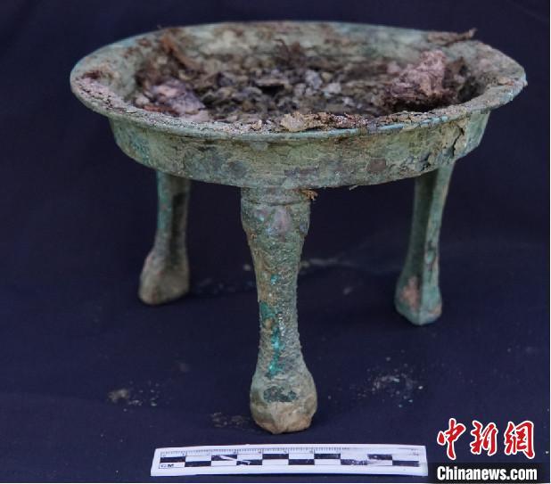 蒙古國高勒毛都2號墓地編號M20墓葬中出土的銅三足盤。河南省文物考古研究院供圖