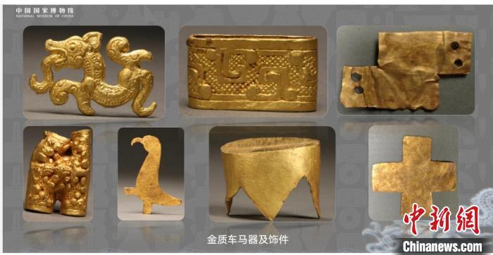 陜西寶雞下站遺址出土的金質車馬器及飾件。 (中國國家文物局供圖)
