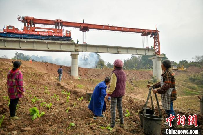 12月21日下午,隆黃鐵路隆敘段擴能改造工程鋪架施工受到當地村民關注。劉忠俊 攝