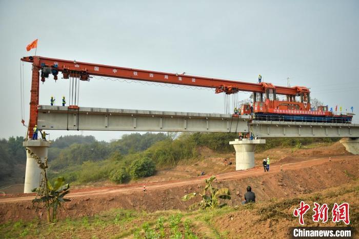 中新網瀘州12月21日電 (記者 王鵬 劉忠俊)21日下午,隨著一片長32米、重134噸的T梁平穩準確落位,由蜀道集團主導投資建設的隆黃鐵路隆昌至敘永段(簡稱隆黃鐵路隆敘段)擴能改造工程正式啟動鋪架,項目線上工程全面展開。