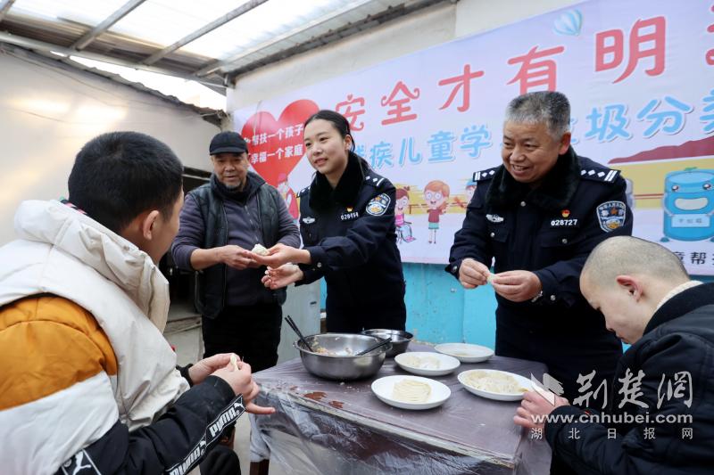 荊楚網(wǎng)(湖北日?qǐng)?bào)網(wǎng))訊(通訊員 王威 應(yīng)后威 王輝)“先捏住中間,再兩邊對(duì)折,然后這么一按,就包好了。” 12月22日冬至,當(dāng)天上午,武漢的氣溫已經(jīng)降至零度,但在武漢愛(ài)心殘疾兒童幫扶中心里卻是暖意融融,民警熊遠(yuǎn)文、向子晴正和這里的特殊兒童一起包餃子。