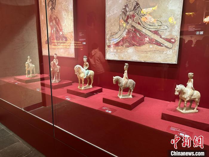 唐墓中的壁畫和彩色陶俑是唐代極具代表性的藝術珍品。記者在展廳看到,女性陶俑類型多樣,各種女坐俑、立俑、侍俑、樂舞俑、騎馬俑、貴婦俑……這些女俑造型生動,尤其是三彩女俑,釉色艷麗,呈現了唐代女性“千人千面”的生存狀態。