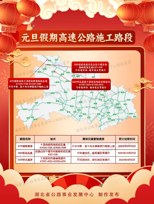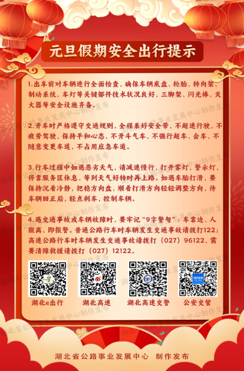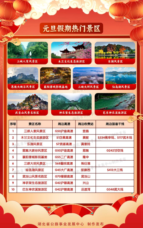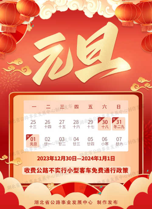 荊楚網(湖北日報網)訊(記者 趙秀琳 通訊員 王秀娟、王曦)2024年元旦假期即將來臨,放假時間為2023年12月30日至2024年1月1日,共計三天,收費公路不實行免費通行政策。湖北省公路事業發展中心、湖北省能源局、國網湖北省電力有限公司編制并聯合發布《2024年元旦假期湖北省干線公路出行指南》,為公眾出行提供參考。