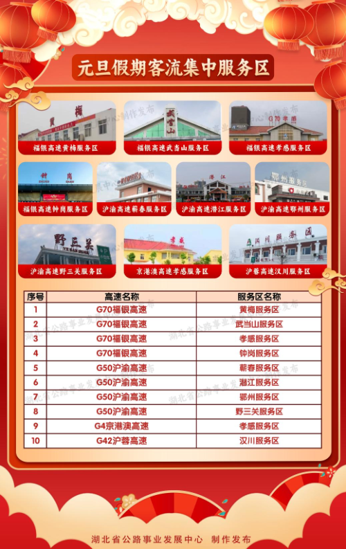 客流集中服務區主要有G70福銀高速黃梅服務區、武當山服務區、孝感服務區、鐘崗服務區;G50滬渝高速蘄春服務區、潛江服務區、鄂州服務區、野三關服務區;G4京港澳高速孝感服務區;G42滬蓉高速漢川服務區。