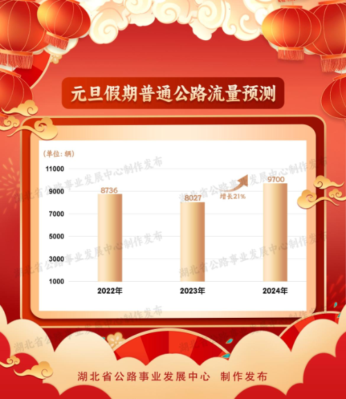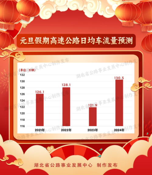 湖北省公路事業發展中心通過分析歷年來路網運行數據,結合近期全省路網天氣、車流量等運行實際,預計元旦期間高速路網通行車流量達到384-399萬輛,日均約128-133萬輛,較近期平日日均流量增長25%-30%,較2022年同期日均流量、2021年同期日均流量均有小幅增長。