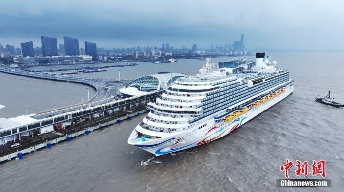 圖為航拍“愛達·魔都號”抵達上海寶山吳淞口國際郵輪港。(無人機照片)中新社記者 殷立勤 攝