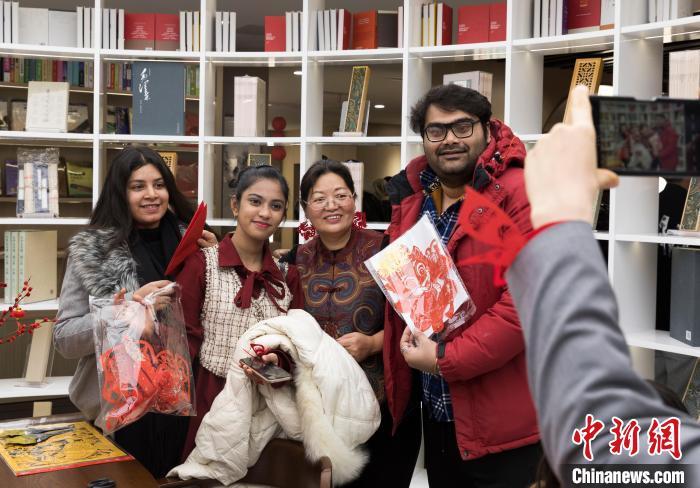 外國留學生與剪紙教師合影留念。中新網記者 楊迪 攝