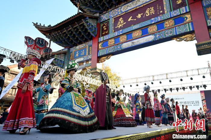 圖為“首屆中國(guó)·楚雄時(shí)裝周”在云南楚雄啟幕,來(lái)自永仁縣的代表展示傳統(tǒng)民族服飾。中新網(wǎng)記者 李嘉嫻 攝
