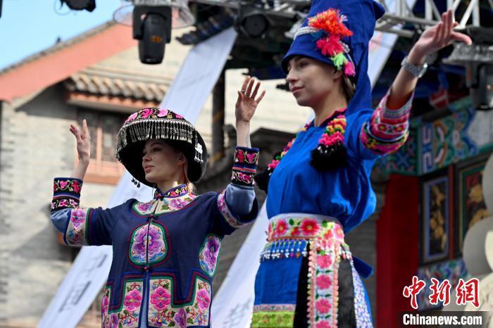 圖為“首屆中國(guó)·楚雄時(shí)裝周”啟幕儀式上,外籍模特身著中國(guó)傳統(tǒng)民族服飾。中新網(wǎng)記者 李嘉嫻 攝