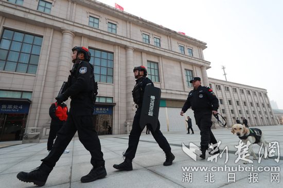 武漢鐵路公安處警犬訓(xùn)導(dǎo)員與特警在漢口火車站北售票廳外巡邏。胡金力 攝