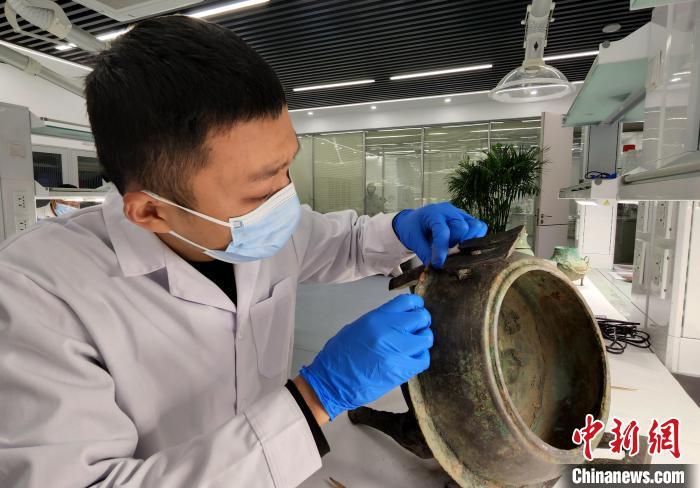 山東文物修復人員正在修復一件戰國銅鼎。趙曉 攝