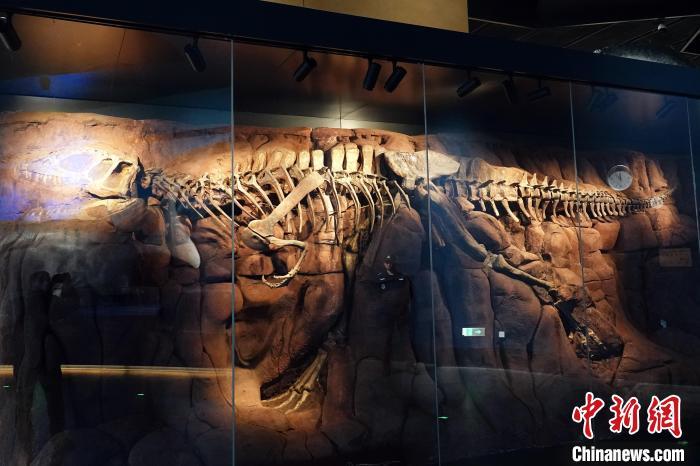 1月3日,目前亞洲規(guī)模最大的自然科學(xué)類專題博物館——中國古動物館(保定自然博物館)建成后正式面向公眾開放,圖為該館“鎮(zhèn)館之寶”之一的世界唯一中華猛龍“董氏中華猛龍”骨架化石。中新網(wǎng)記者 孫自法 攝