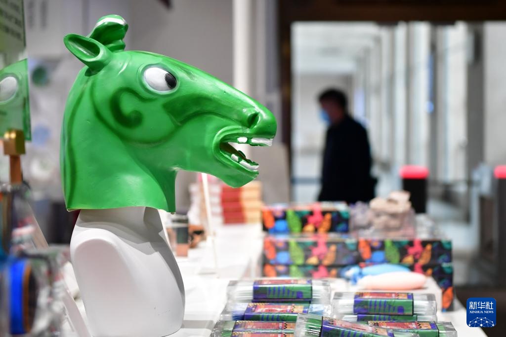 在甘肅省博物館文創(chuàng)商店拍攝的以銅奔馬為主題設(shè)計(jì)的“綠馬頭套”(2022年5月13日攝)。