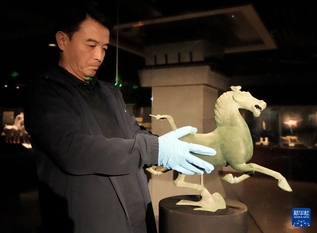 工作人員在甘肅省博物館展廳內(nèi)安放銅奔馬(2023年10月27日攝)。