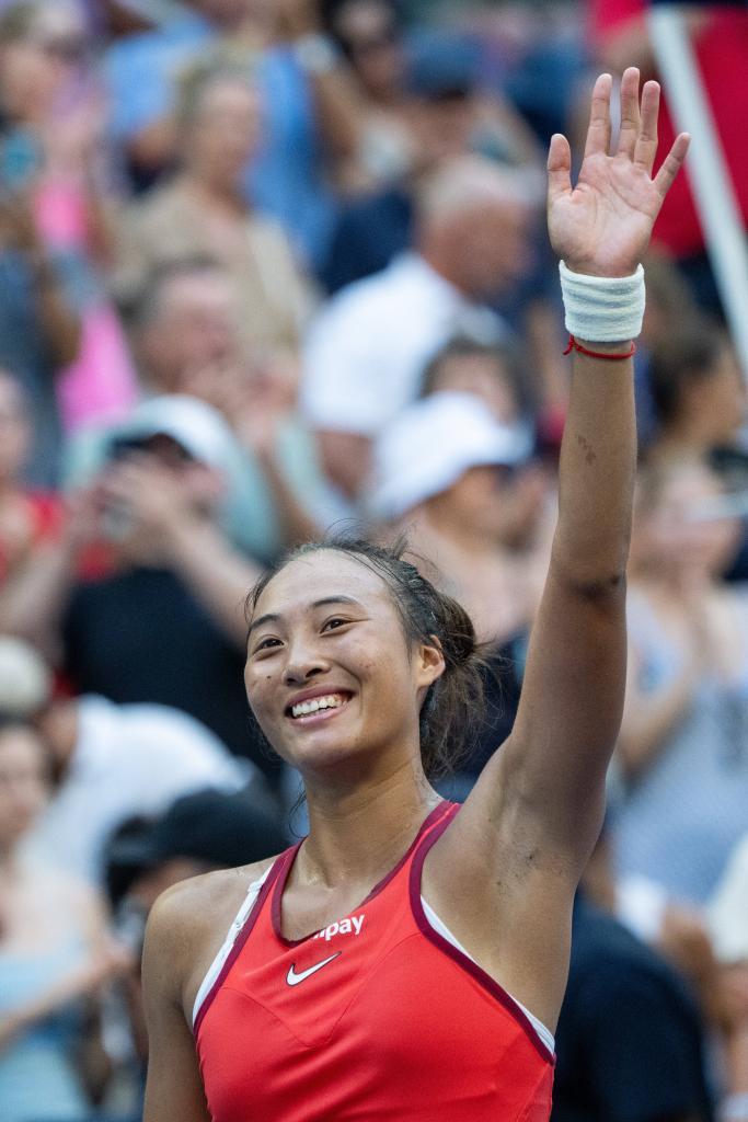 2023年9月4日,鄭欽文在美國網(wǎng)球公開賽女子單打比賽中晉級八強(qiáng)后慶祝。新華社記者 劉杰 攝