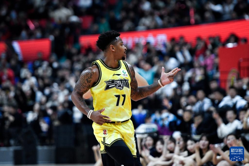 1月5日,吉林九臺(tái)農(nóng)商銀行隊(duì)球員皮特森慶祝進(jìn)球。新華社記者 許暢 攝