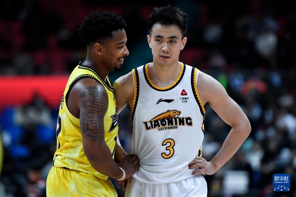 1月5日,吉林九臺(tái)農(nóng)商銀行隊(duì)球員皮特森(左)與遼寧本鋼隊(duì)球員趙繼偉互動(dòng)。新華社記者 許暢 攝