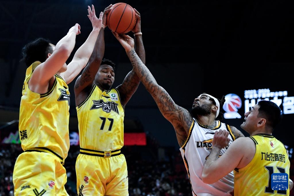 1月5日,遼寧本鋼隊(duì)球員莫蘭德(右二)與吉林九臺(tái)農(nóng)商銀行隊(duì)球員皮特森(左二)爭(zhēng)搶籃板球。新華社記者 許暢 攝
