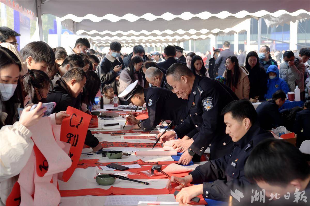 在送春聯祝福區,武漢警營的書畫家現場揮毫潑墨,向群眾贈送新春祝福書法、繪畫作品。