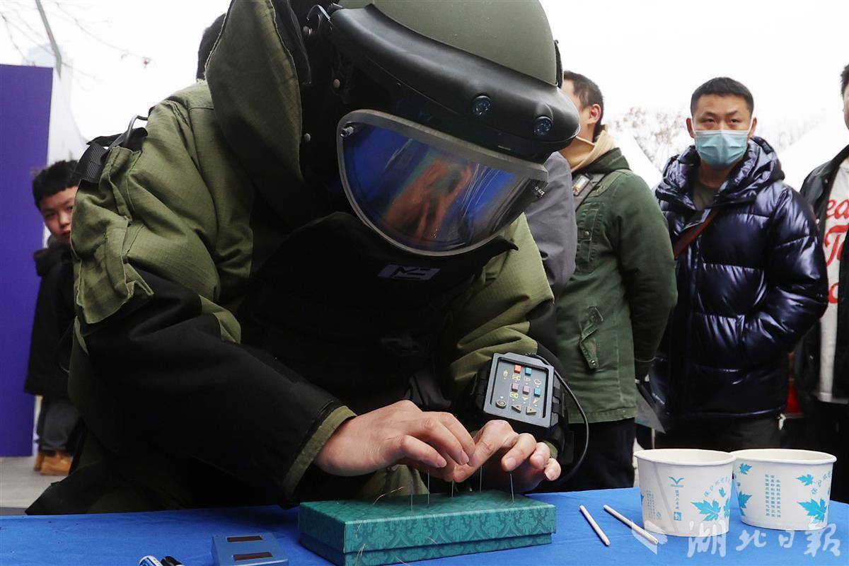穿戴上重達70多斤的排爆服,在5分鐘內挑戰夾豆子10顆,穿針引線5枚,就可以登上“平安江城英雄榜”。你敢挑戰嗎?市民戴小姐現場挑戰,她在民警的幫助下,才好不容易穿上排爆服。