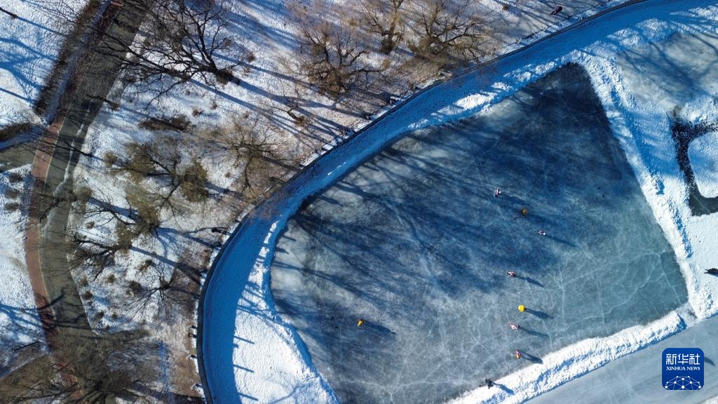 1月7日,冰球愛好者在沈陽市勞動公園人工湖上打冰球(無人機照片)。新華社記者 陳為 攝
