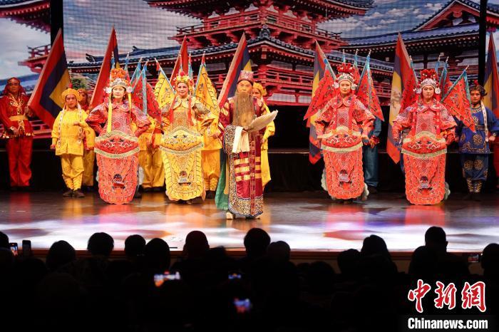 當(dāng)?shù)貢r間1月7日晚,馬力(中)表演京劇《空城計》選段。中新社記者 余瑞冬 攝