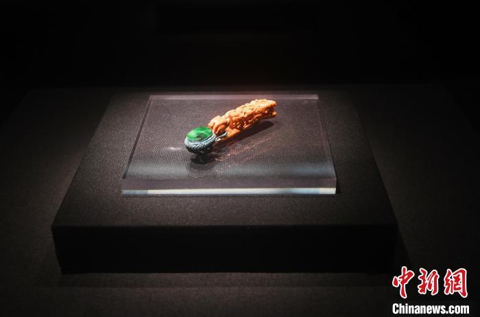 1月8日, 清代翡翠珊瑚蒼龍教子紋帶鉤在重慶中國三峽博物館展出。中新社記者 周毅 攝