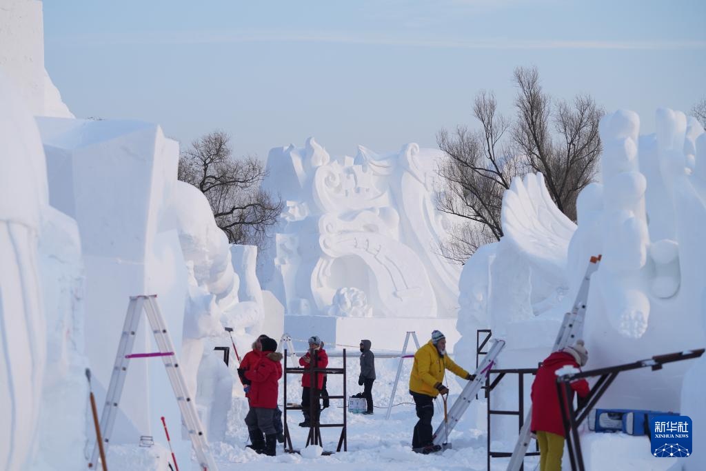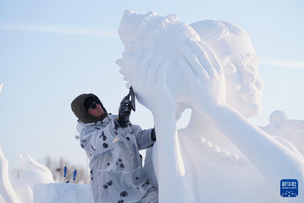 當日,在哈爾濱太陽島雪博會園區內舉行的第26屆中國·哈爾濱國際雪雕比賽進入第三天的賽程。