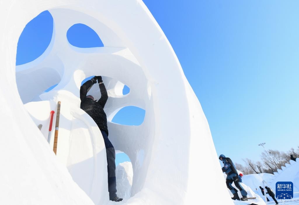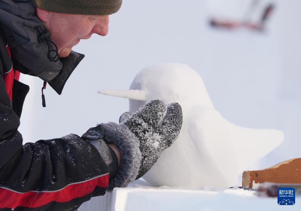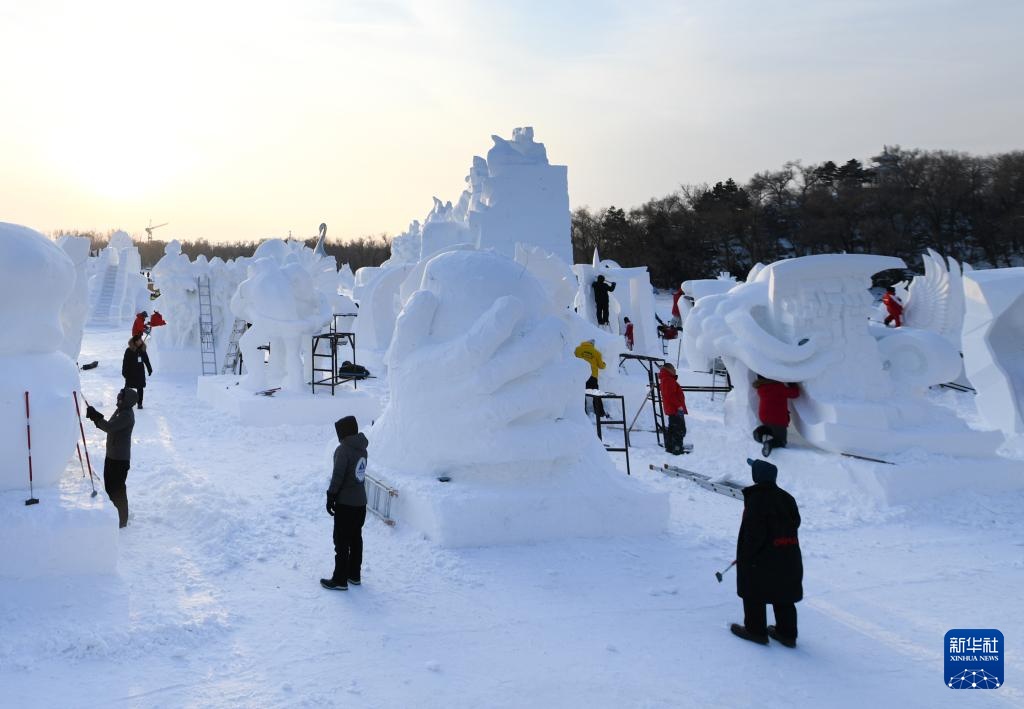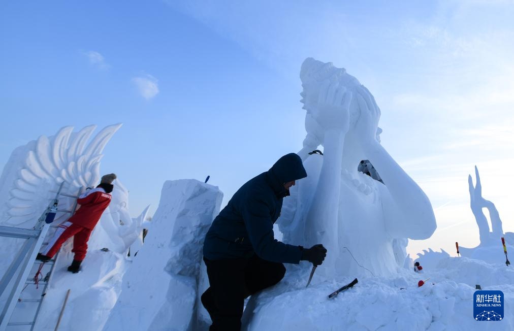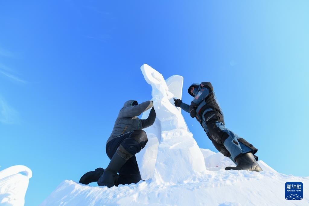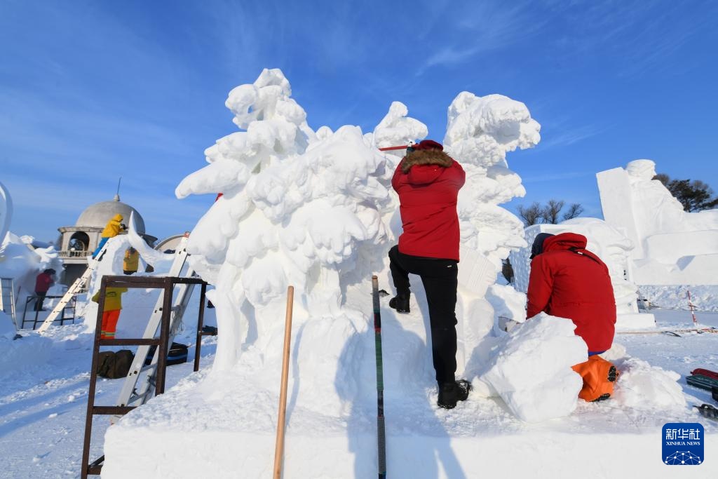 1月8日,選手在太陽島雪博會園區內制作雪雕。