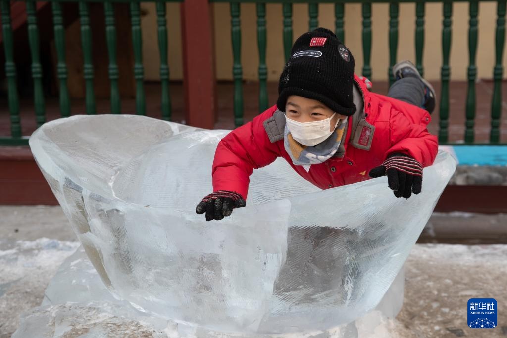 1月8日,游客在哈爾濱市道外區(qū)中華巴洛克歷史文化街區(qū)內(nèi)玩冰滑梯。