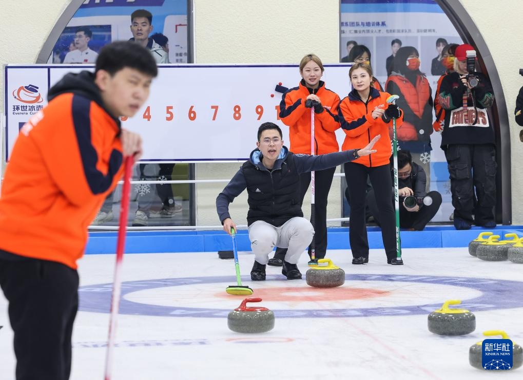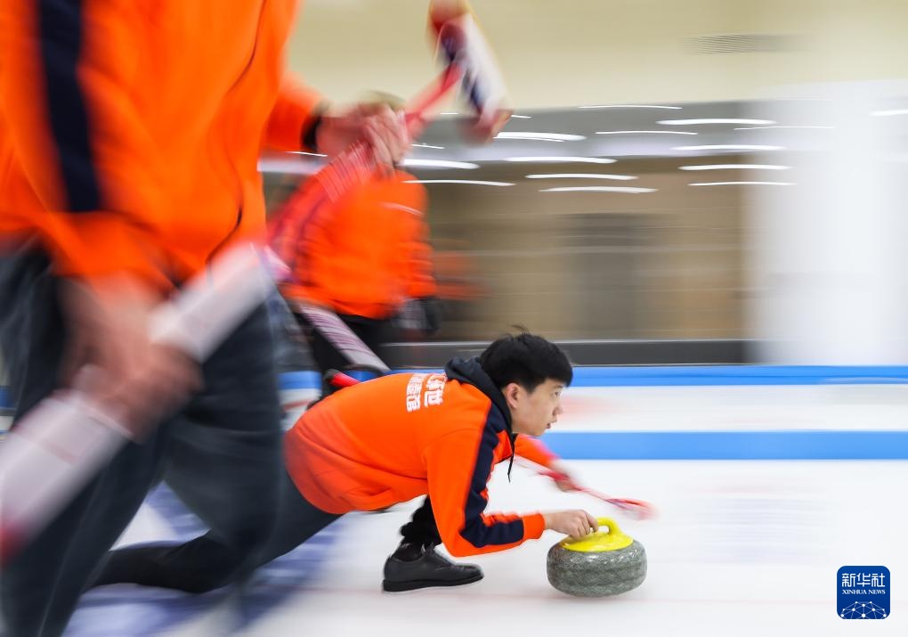 1月9日,珠江環世冰壺隊選手劉函龍(中)在比賽中擲壺。新華社記者 劉大偉 攝