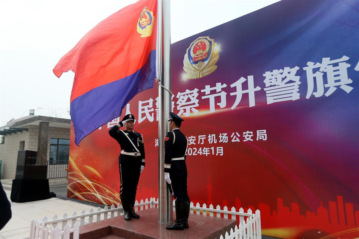 當日上午9時,升警旗儀式正式開始,儀仗隊伍英姿挺拔、步伐鏗鏘,護衛警旗正步走向升旗臺。擎旗手揮臂揚旗,鮮艷的警旗冉冉升起。“我是中國人民警察,我宣誓:堅決擁護中國共產黨的絕對領導,矢志獻身崇高的人民公安事業,對黨忠誠、服務人民、執法公正、紀律嚴明……”機場公安局民警身著警禮服整齊列隊,面向警旗莊嚴敬禮,重溫人民警察誓詞。