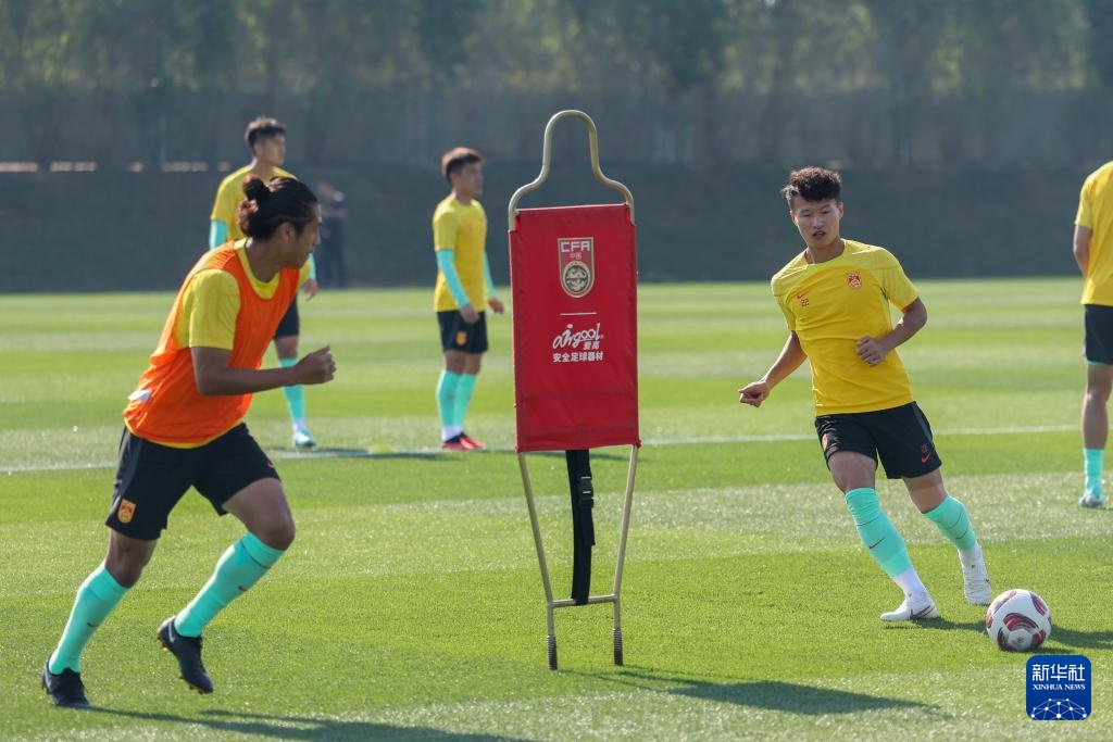 1月10日,中國隊球員林良銘(右二)與張玉寧(左)在訓練中。新華社記者 孫凡越 攝