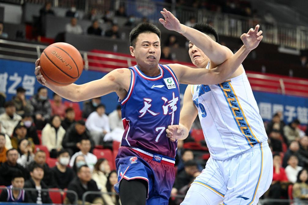1月10日,天津隊(duì)球員李榮培(左)在比賽中突破。新華社記者趙子碩攝