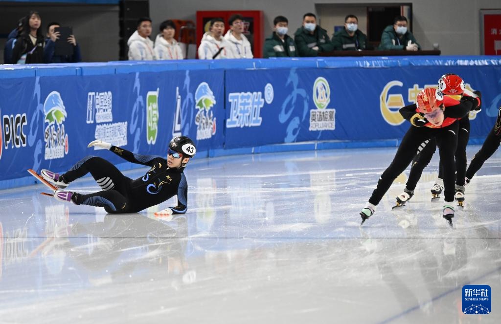 1月11日,湖北隊選手孔偉琪(左一)在女子1500米四分之一決賽中摔倒。新華社記者 連振 攝