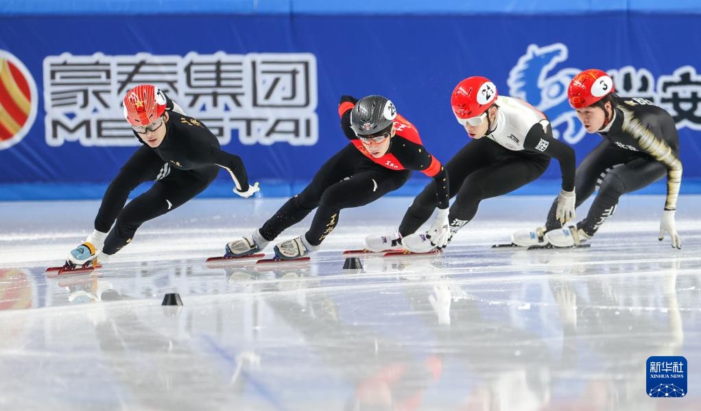 1月11日,湖北隊選手王天佑、內蒙古隊選手吳世強、黑龍江隊選手田珉碩、河南隊選手李禹衡(從右至左)在男子1500米四分之一決賽中。新華社記者 王楷焱 攝