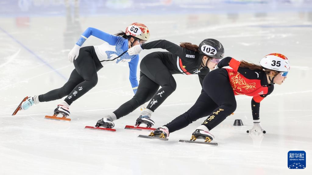 1月11日,黑龍江隊選手楊婧茹、天津隊選手侯雨茗、內蒙古隊選手趙嘉諾(從右至左)在女子1500米四分之一決賽中。新華社記者 王楷焱 攝
