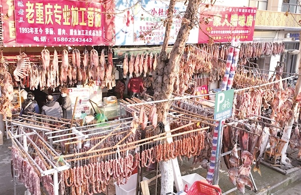 “這兩年,每到春節前一個月,就會專門到這里來打年貨。”家住漢口后湖的市民黃先生驅車來到這座府河邊的大曬場,給家人采購了4條大草魚腌制的臘魚、6刀臘肉、3只臘鴨和20斤臘腸:“我們組團來打年貨,都是給一大家子人采購回去。”