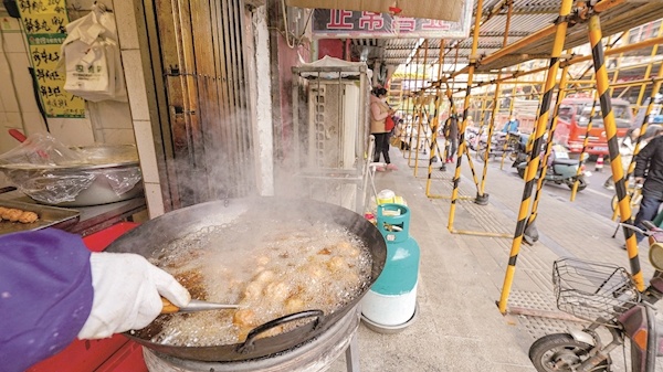 同樣熱鬧的場景也出現在漢口武勝路、崇仁路、集賢路一帶的街頭。當前年貨生意最火爆的當數灌制臘腸、炸圓子等現場制作的“年味”,市場上的競爭也愈加激烈。