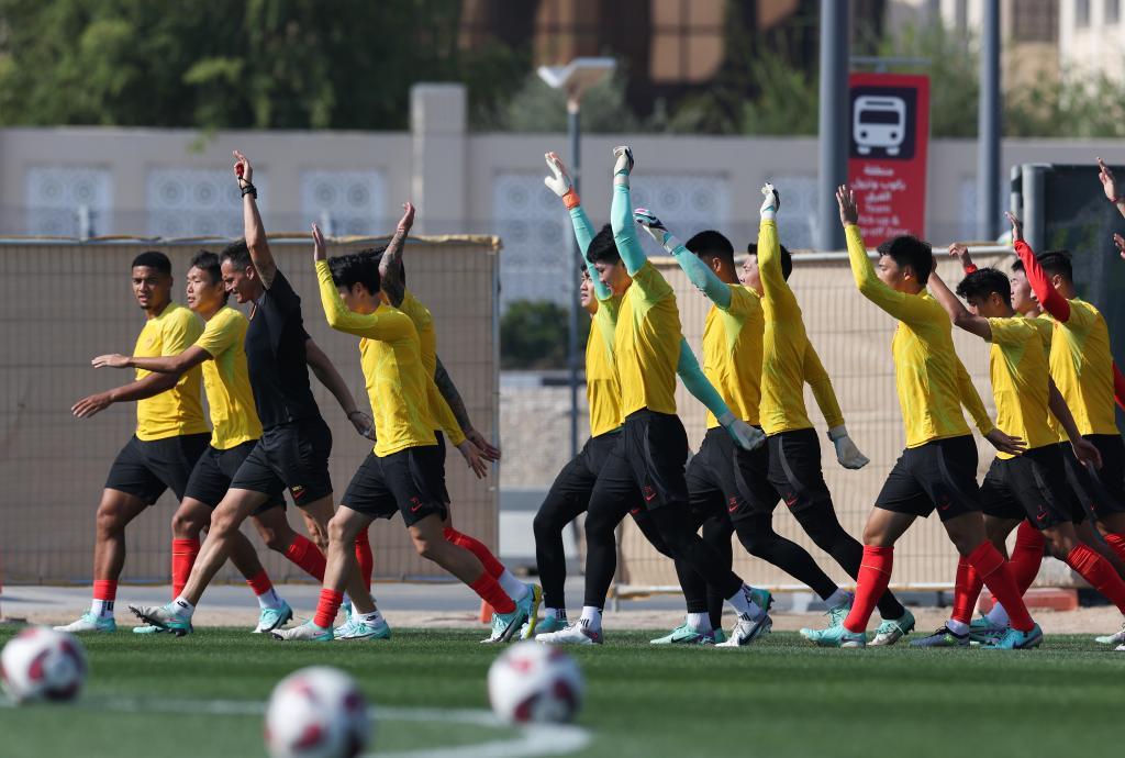 1月11日,中國男足隊員在卡塔爾多哈進行訓練,備戰將于1月12日開賽的卡塔爾男足亞洲杯。新華社記者丁汀攝