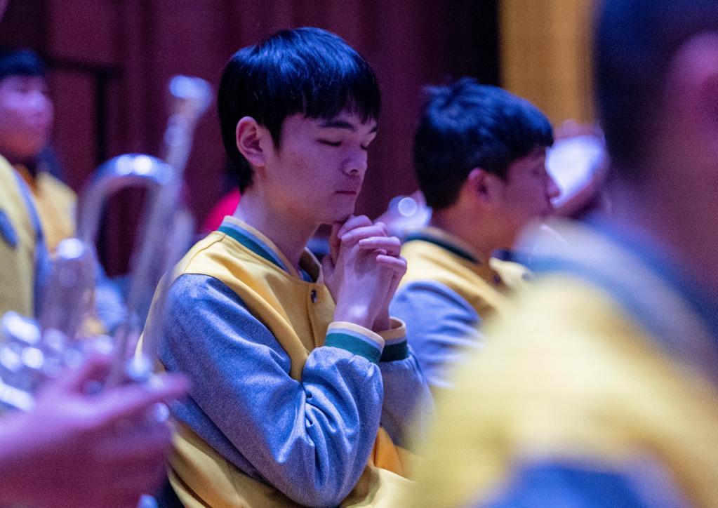 1月6日,在重慶市特殊教育中心的揚帆音樂廳,揚帆管樂團成員王太樊在聽合唱《如愿》時許愿。