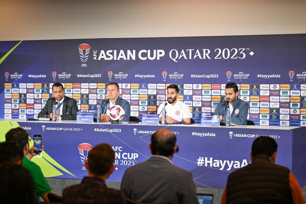 1月11日,黎巴嫩隊主教練米奧德拉格·拉杜諾維奇(左二)與球員哈桑·馬圖克(右二)在新聞發布會上。新華社記者孫凡越攝