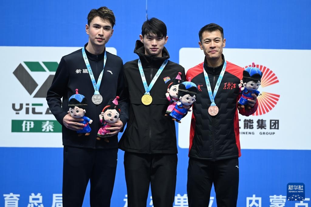 1月11日,遼寧隊選手沈晗揚(中)、新疆隊選手葉爾哈那提·阿依提納馬(左)和黑龍江隊選手寧忠巖在頒獎典禮上合影。新華社記者 連振 攝
