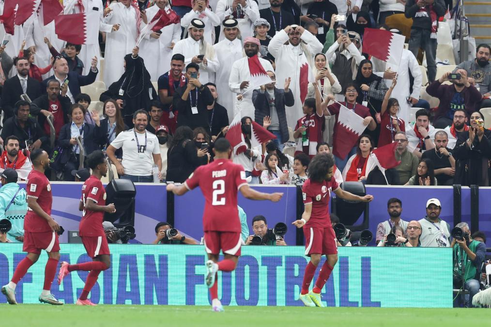 1月12日,卡塔爾隊球員阿克拉姆·阿菲夫(前右一)在比賽中慶祝進球。新華社記者 丁汀 攝