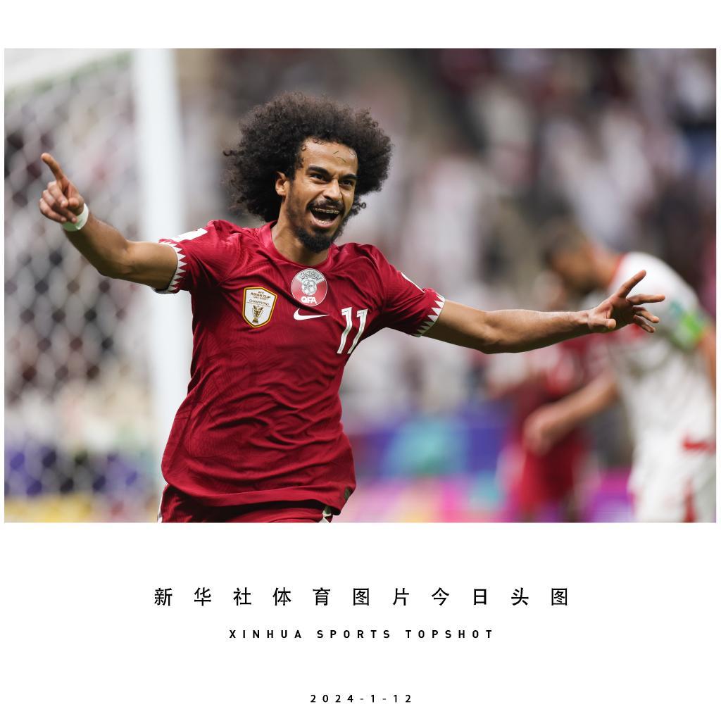 1月12日,卡塔爾隊球員阿克拉姆·阿菲夫慶祝進球。