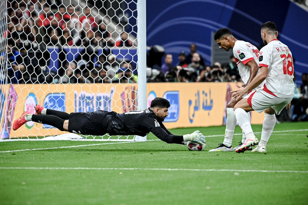 1月12日,男足亞洲杯揭幕戰中,黎巴嫩隊守門員穆斯塔法·馬塔爾(左)在比賽中撲救。新華社記者 江漢 攝